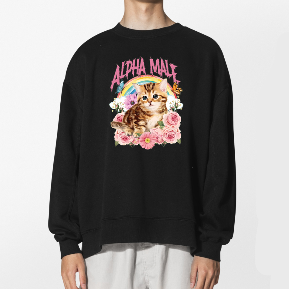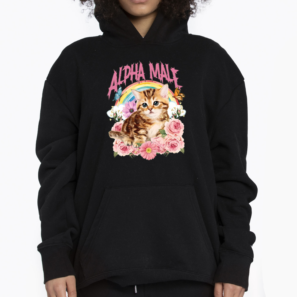 One of the most striking features of the Alpha Male T-Shirt is its creative graphic that contrasts the phrase “Alpha Male” with an adorable kitten illustration. Surrounded by colorful flowers and soft decorative elements, the design delivers a humorous twist that makes the shirt both charming and memorable.