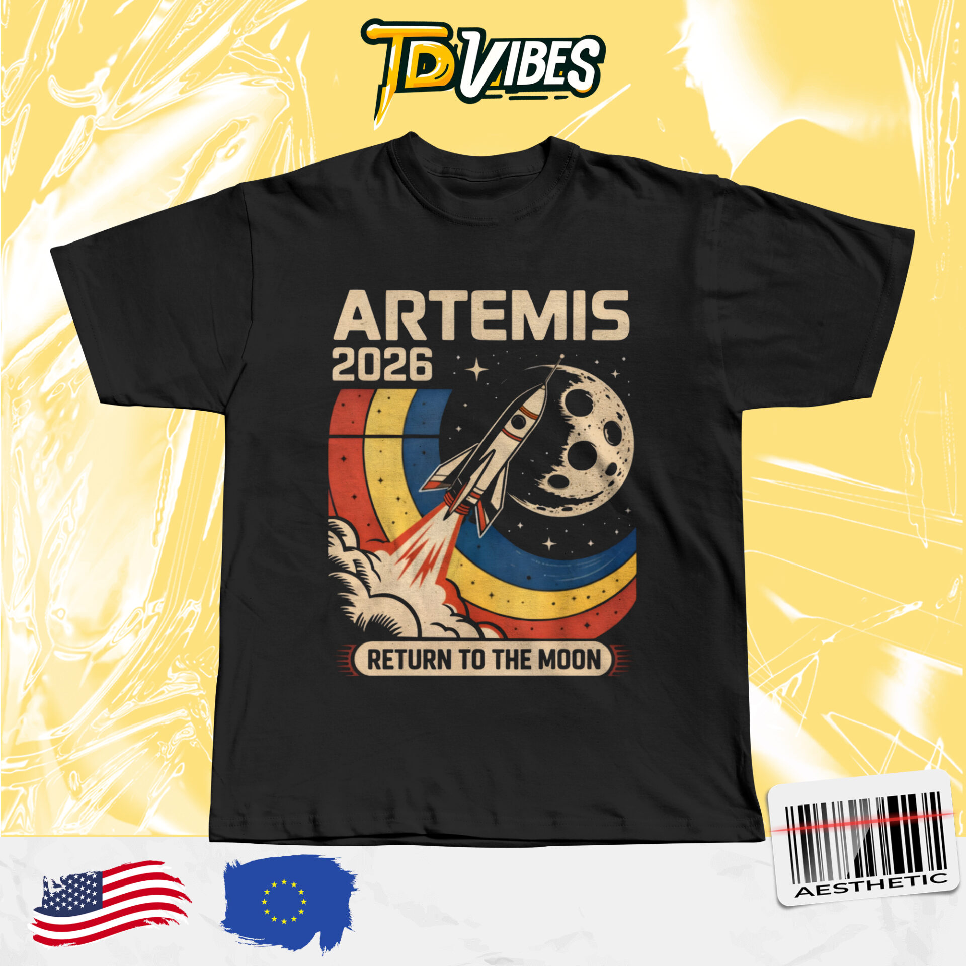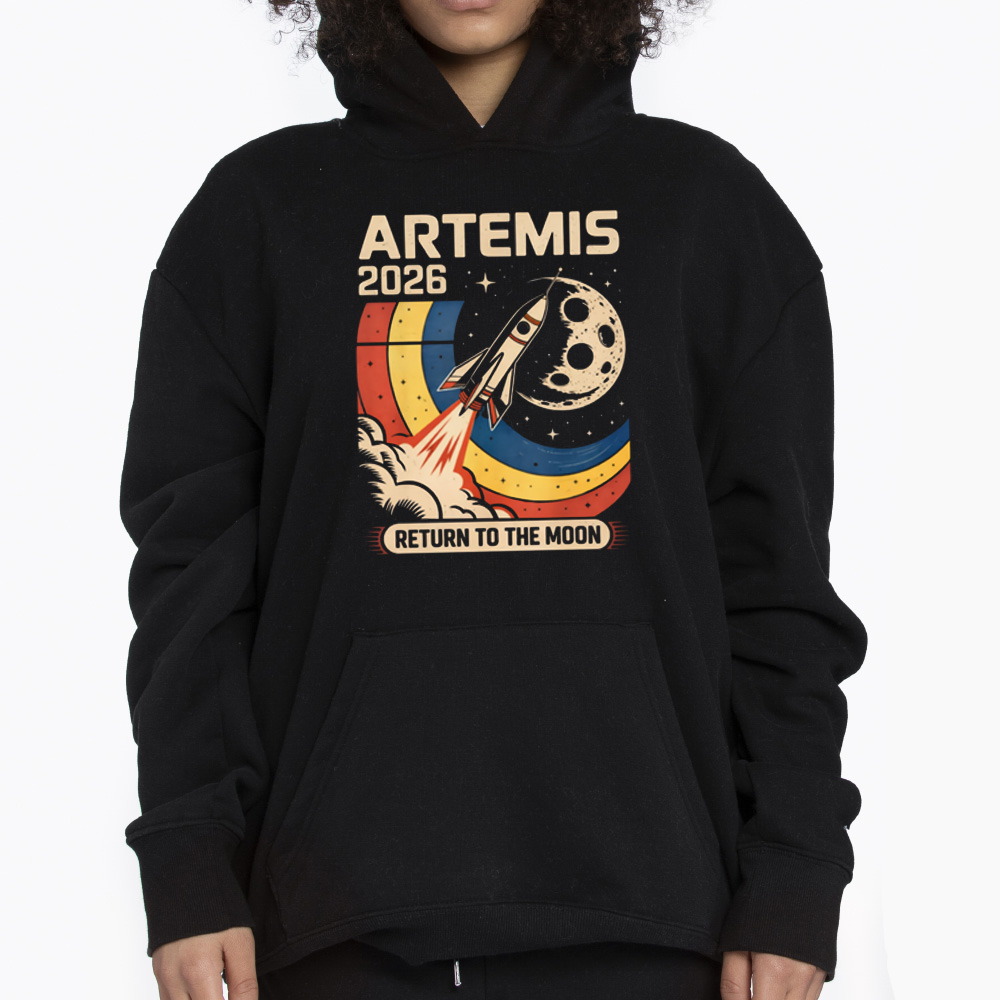 This shirt features a vibrant, vintage-style graphic of a rocket launching toward the moon, combined with colorful retro stripes and bold “Artemis 2026” typography. The design blends nostalgia with futuristic ambition, making it visually striking and perfect for space enthusiasts.