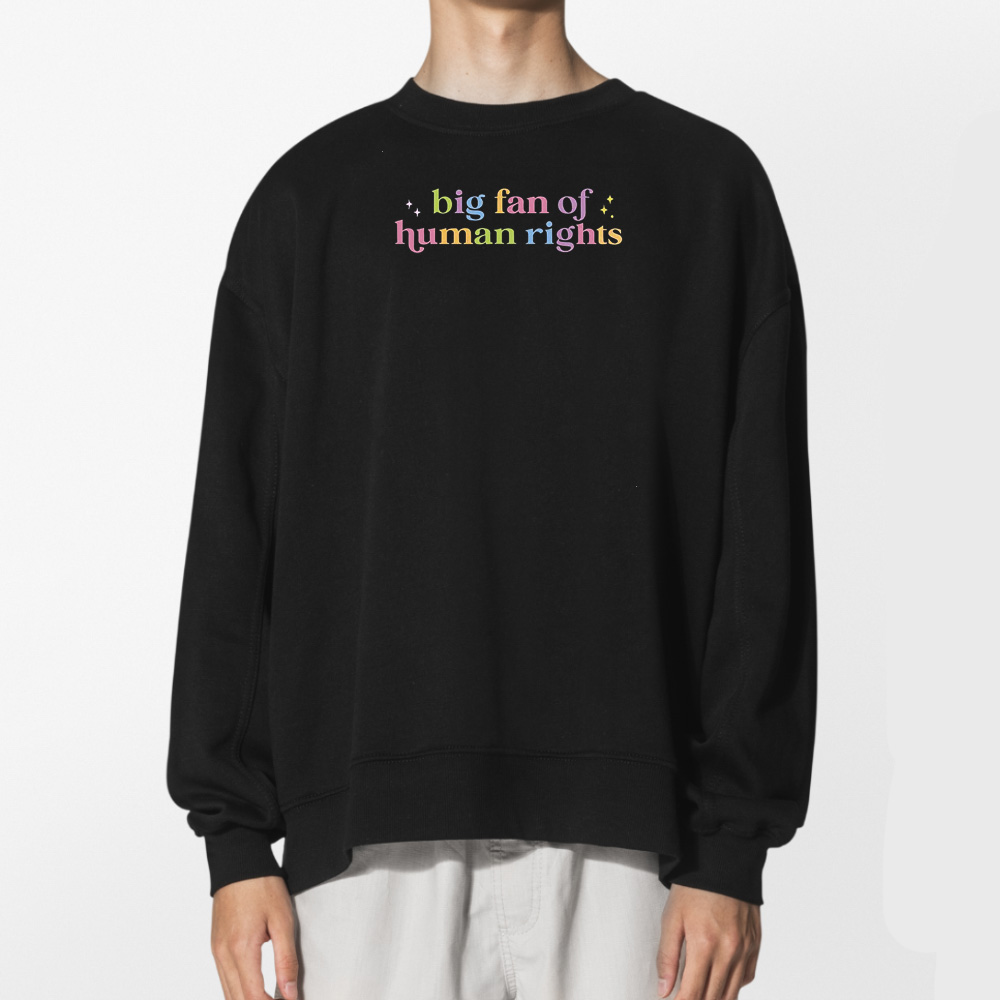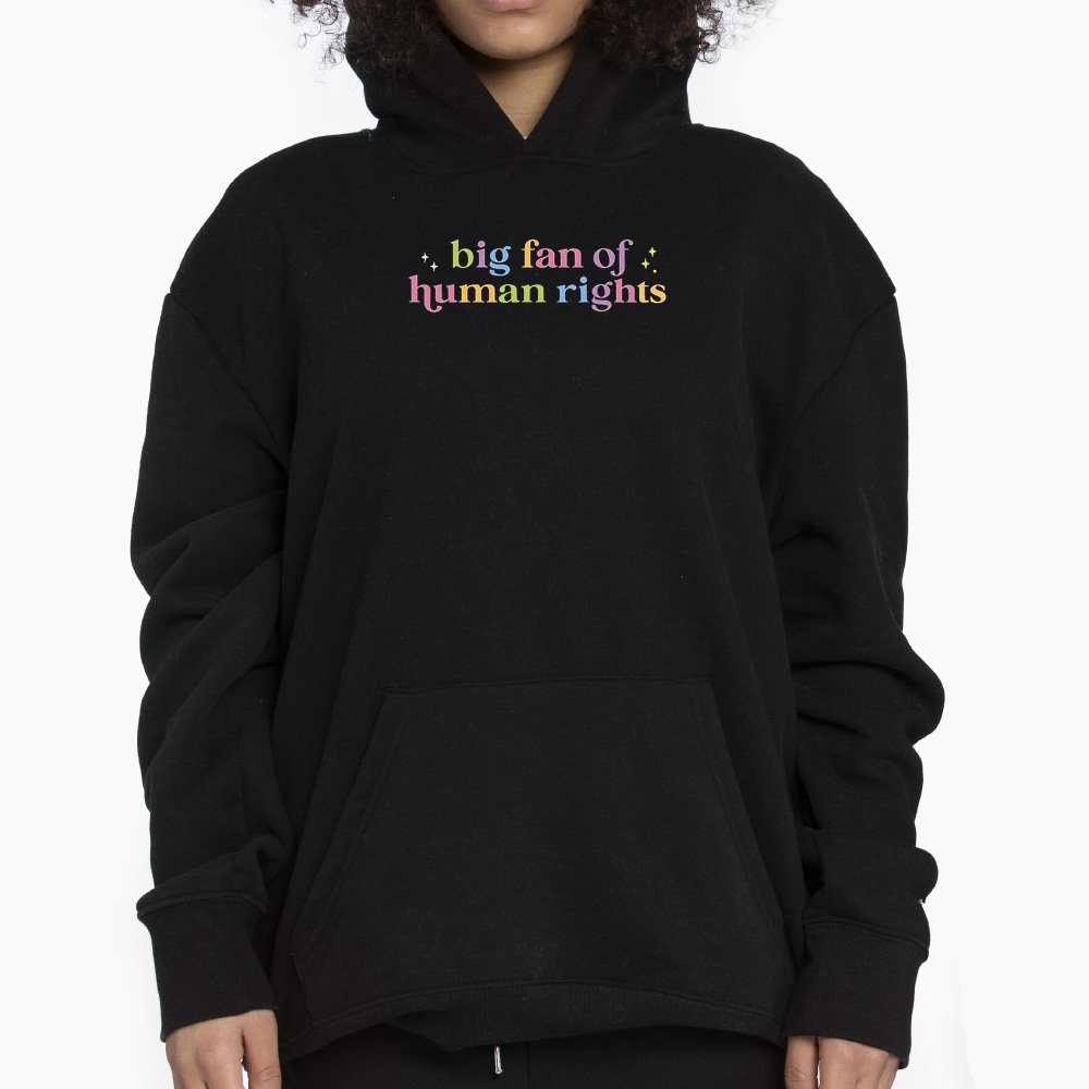 At its core, this design stands for human rights in the broadest sense—fairness, freedom, and equal treatment for everyone. The phrase “Big fan of human rights” communicates support for compassion and justice across all communities, cultures, and identities, making it a timeless and widely relatable statement.