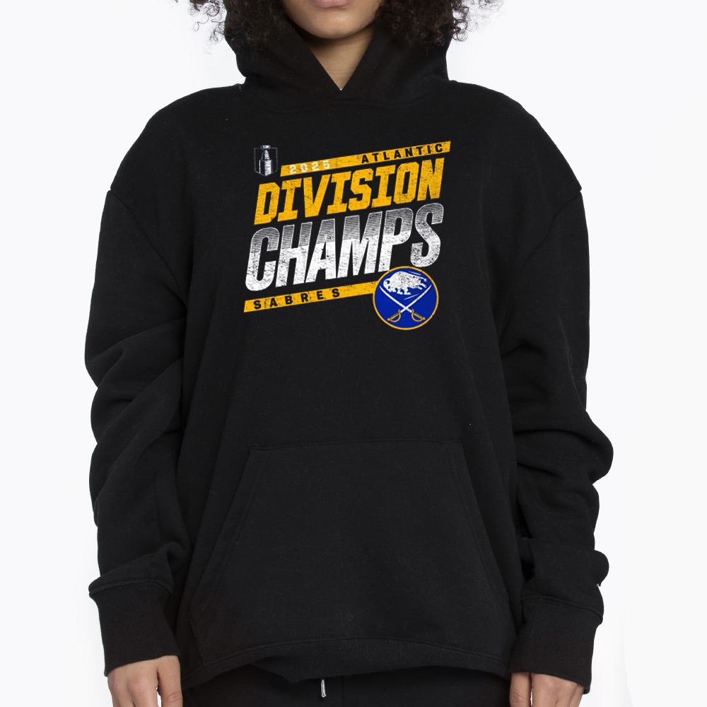 This shirt features a striking “Division Champs” graphic with the Buffalo Sabres logo, highlighted by strong yellow and white typography against a black background. The design captures the excitement of victory and makes your support impossible to miss.