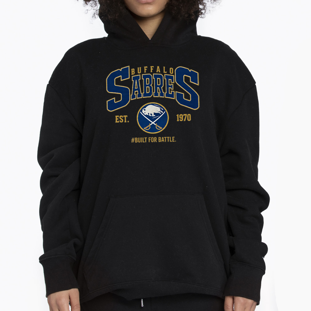 This shirt features the recognizable Buffalo Sabres logo along with “EST. 1970,” celebrating the team’s rich history. The bold typography and emblem create a strong visual impact for true fans.