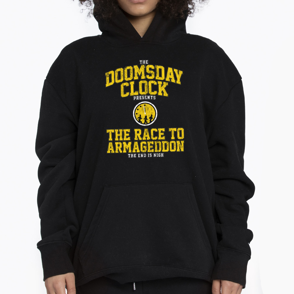 The shirt features a strong, high-contrast graphic centered around the iconic “Doomsday Clock” concept, paired with the phrase “The Race To Armageddon.” This design captures attention instantly and appeals to those who enjoy apparel with deeper meaning and cultural commentary.