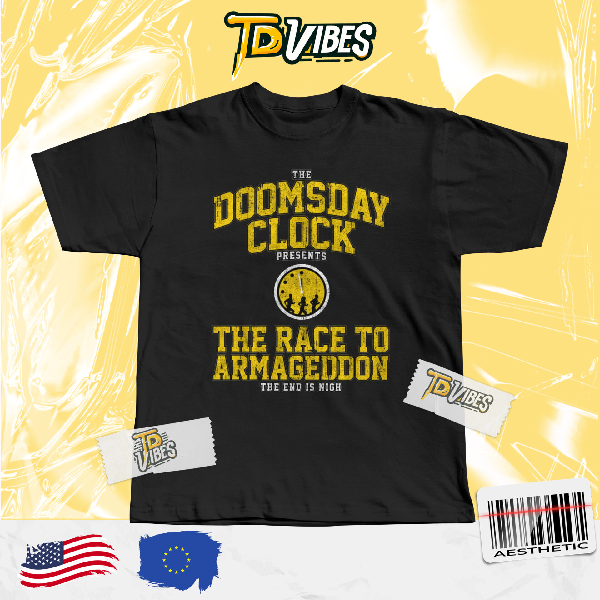 Doomsday Clock The Race To Armageddon Tshirt is a powerful graphic T-shirt inspired by themes of time, urgency, and the fragile future of humanity. With a bold typographic layout and symbolic clock imagery, this design delivers a striking visual message—keep reading on TDVibes to explore what makes this shirt a standout piece in statement streetwear.