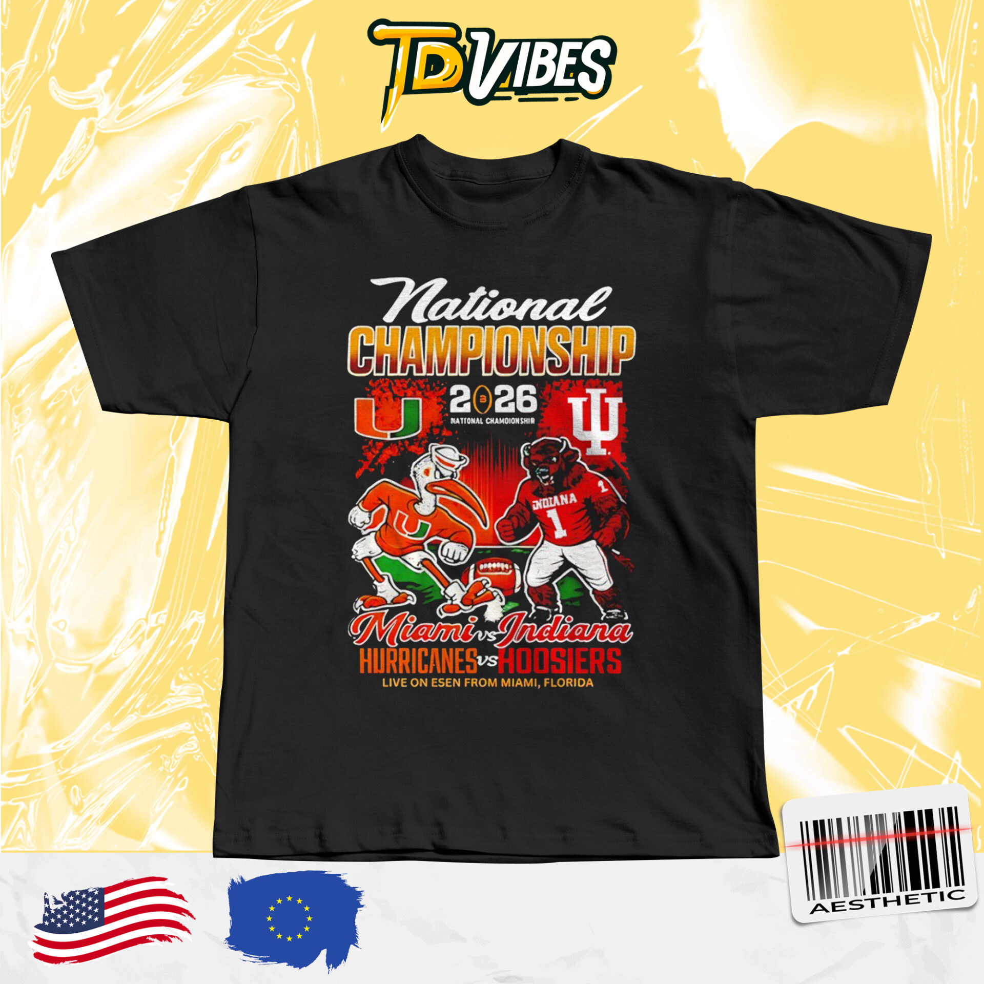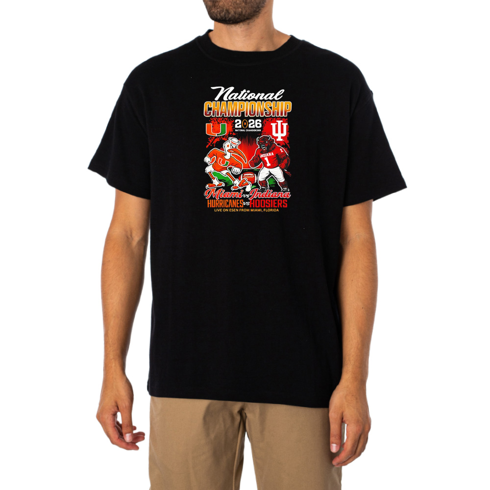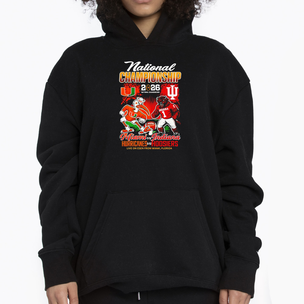 The front graphic showcases a dramatic face-off between Indiana Hoosiers and Miami Hurricanes, illustrated with aggressive mascots, bold team colors, and championship-style typography. The “National Championship 2026” theme adds historic weight, making the design feel like a true game-day poster brought to life on fabric.