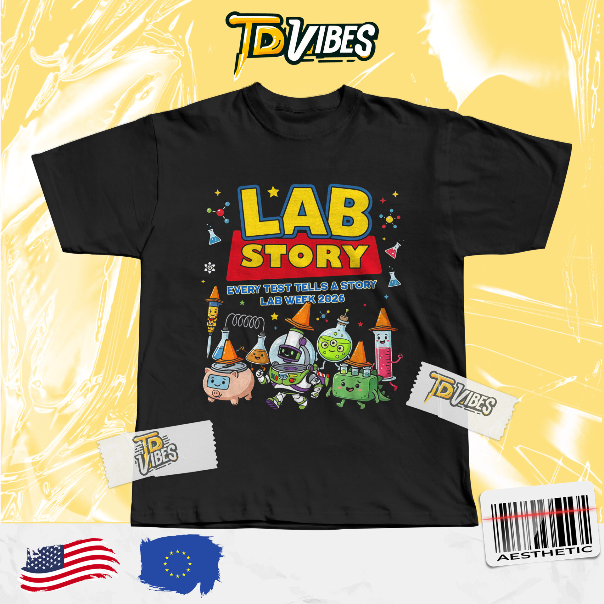This shirt features a colorful “LAB STORY” graphic inspired by a playful, animated style, combined with cute lab equipment characters like beakers, test tubes, and flasks. The design brings a lighthearted twist to science, making it both eye-catching and memorable.