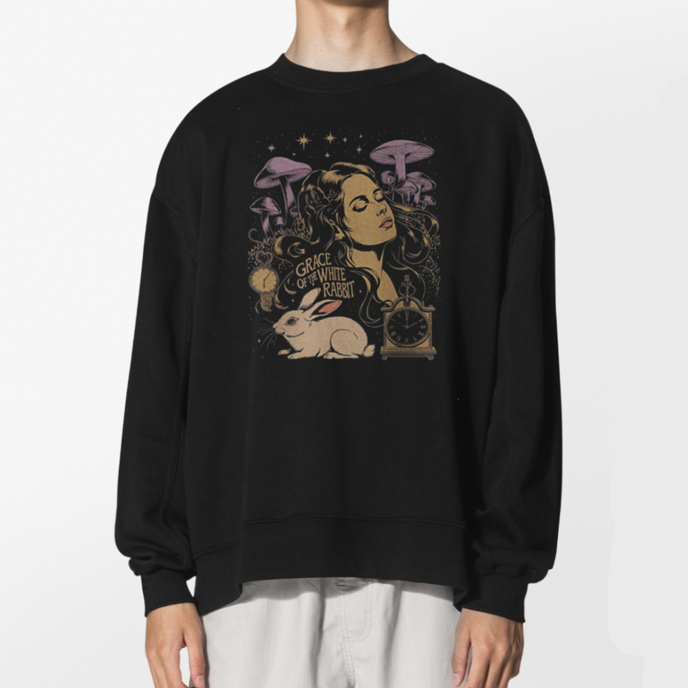 Every element in the design tells a story—clocks symbolize the passage of time, mushrooms hint at altered perception and creativity, while the white rabbit represents curiosity and the journey into the unknown. The phrase “Grace Of The White Rabbit” ties it all together, adding depth and narrative to the visual.