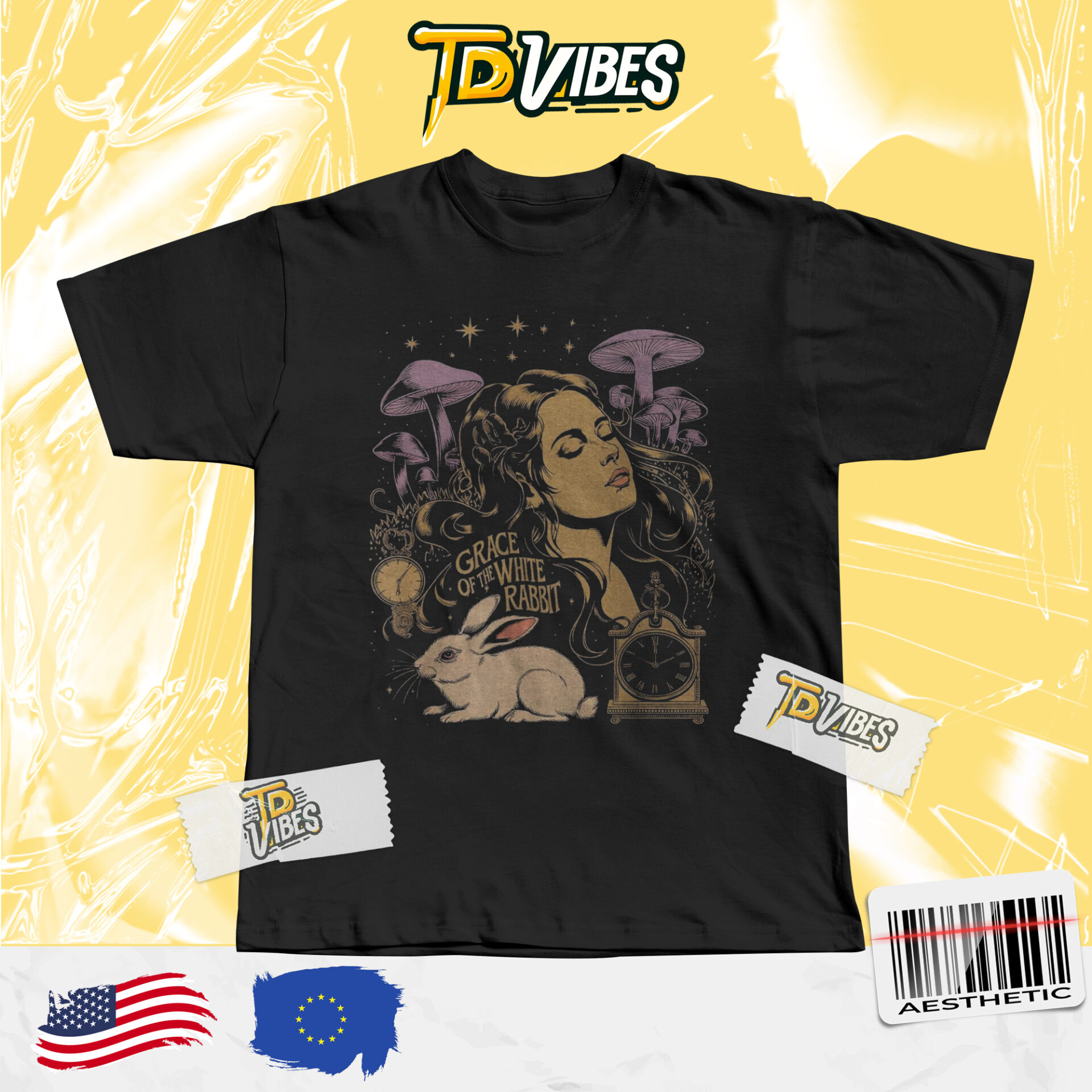 The centerpiece artwork features a graceful female portrait surrounded by mushrooms, clocks, stars, and the iconic white rabbit. This layered composition evokes a psychedelic, Alice-in-Wonderland-inspired atmosphere, giving the T-Shirt a strong artistic identity that feels nostalgic yet timeless.