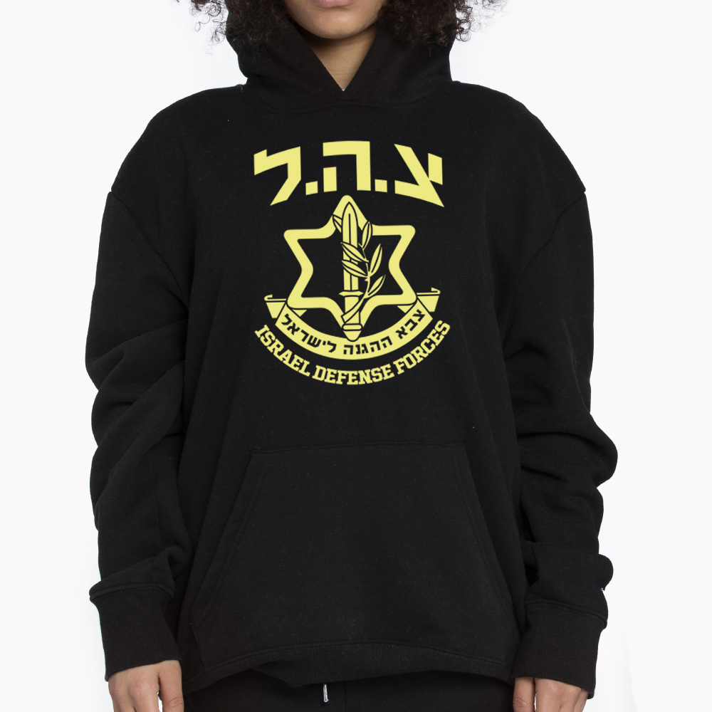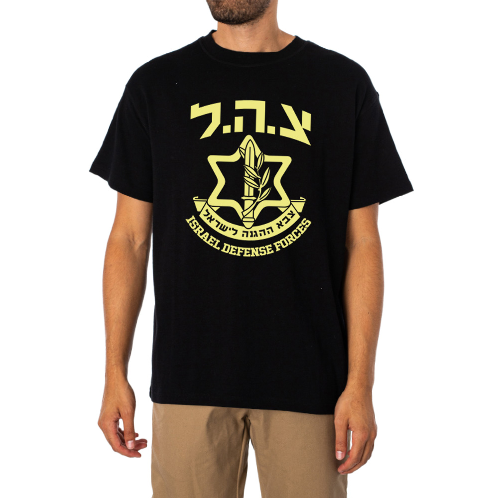 The centerpiece of this design is the classic IDF emblem, capturing the duality of the sword and the olive branch, representing both the necessity of defense and the longing for peace. Framed by the Star of David and the Hebrew text “צה”ל” (Tzahal), the graphic is a recognized symbol of history and dedication. It is a design that carries weight and commands attention, perfect for those who value the significance of the symbols they wear.