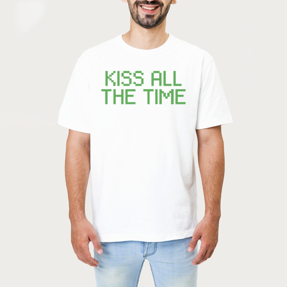 The bold “KISS ALL THE TIME” lettering is presented in a clean, pixel-inspired font that instantly catches the eye. Its simplicity allows the message to stand on its own, making the design timeless, modern, and easy to wear.