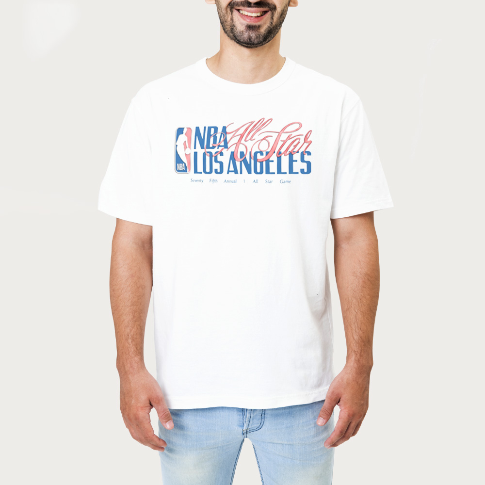 The shirt showcases a bold “NBA All Star Los Angeles” design across the chest, incorporating classic league-inspired typography and dynamic script elements. The combination of structured block letters and flowing script gives the design a celebratory, event-ready look.