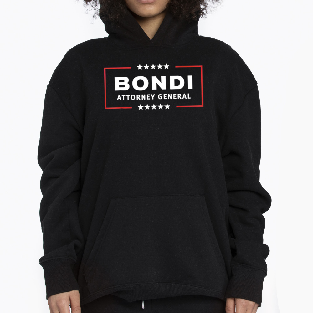 The shirt prominently displays “BONDI ATTORNEY GENERAL” in large, eye-catching lettering. Framed with stars and accent lines, the layout reflects a campaign-inspired aesthetic that immediately draws attention.