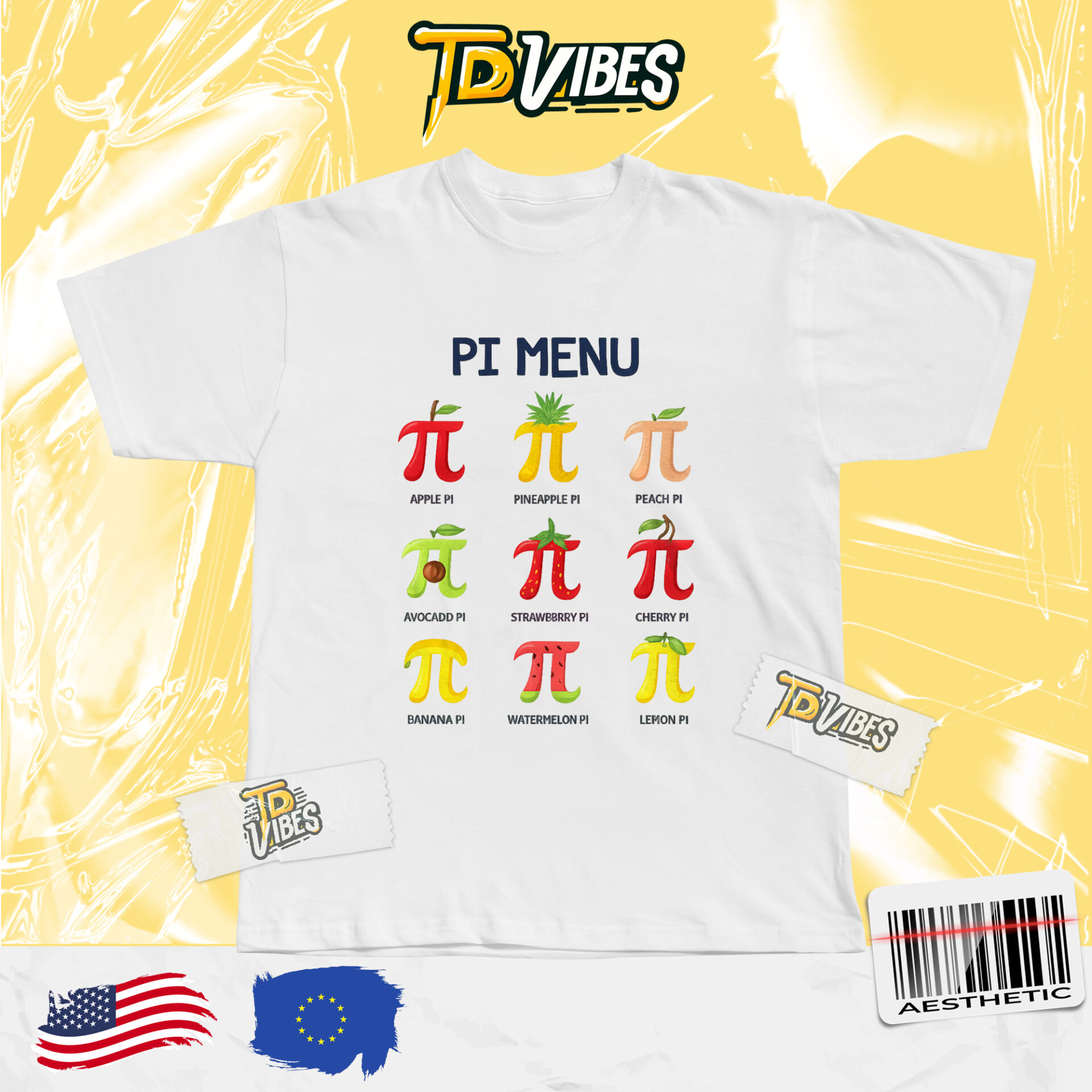 One of the most eye-catching elements of the PI Menu Happy Pi Day Shirt is its playful “Pi Menu” design. The shirt features a collection of colorful π symbols styled like different fruits, such as apple, pineapple, peach, avocado, strawberry, cherry, banana, watermelon, and lemon. This clever visual pun turns the mathematical symbol π into a fun “menu” of fruit-inspired pies.