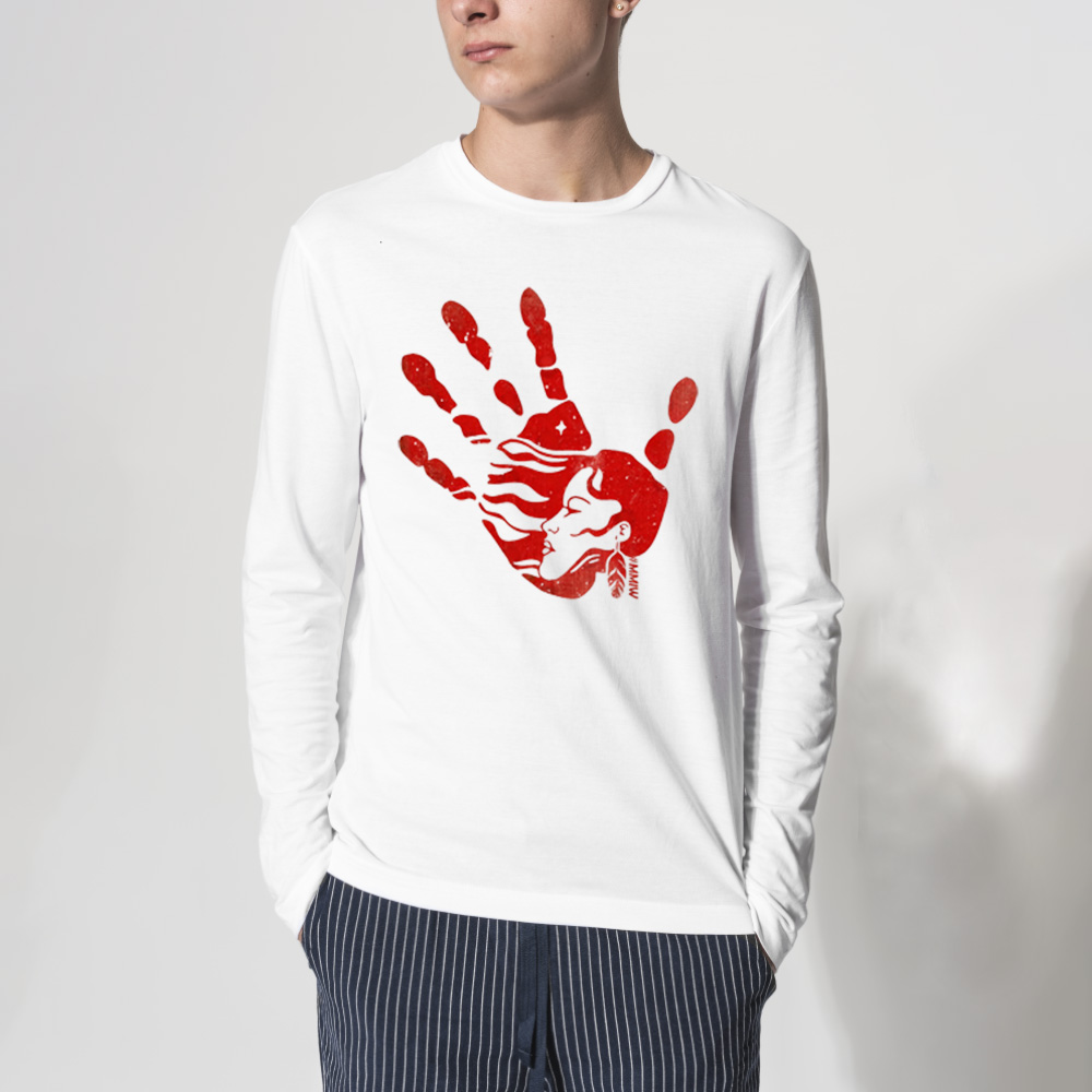 This shirt features the iconic red handprint graphic, a widely recognized symbol representing Missing and Murdered Indigenous Women (MMIW). The design carries deep meaning and helps spark important conversations.