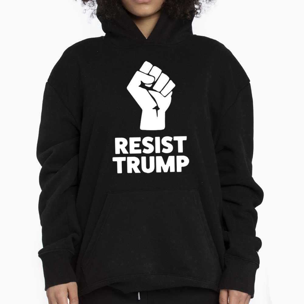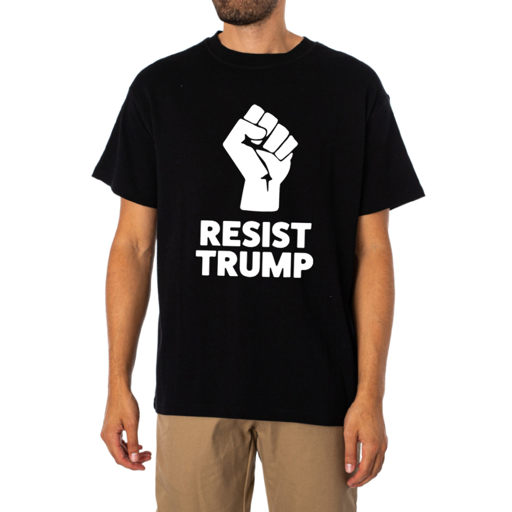 Featuring a bold raised fist graphic paired with the strong “Resist Trump” slogan, this shirt delivers its message in a clean and impactful way. The high-contrast black background with white print enhances visibility, making the design both modern and attention-grabbing.