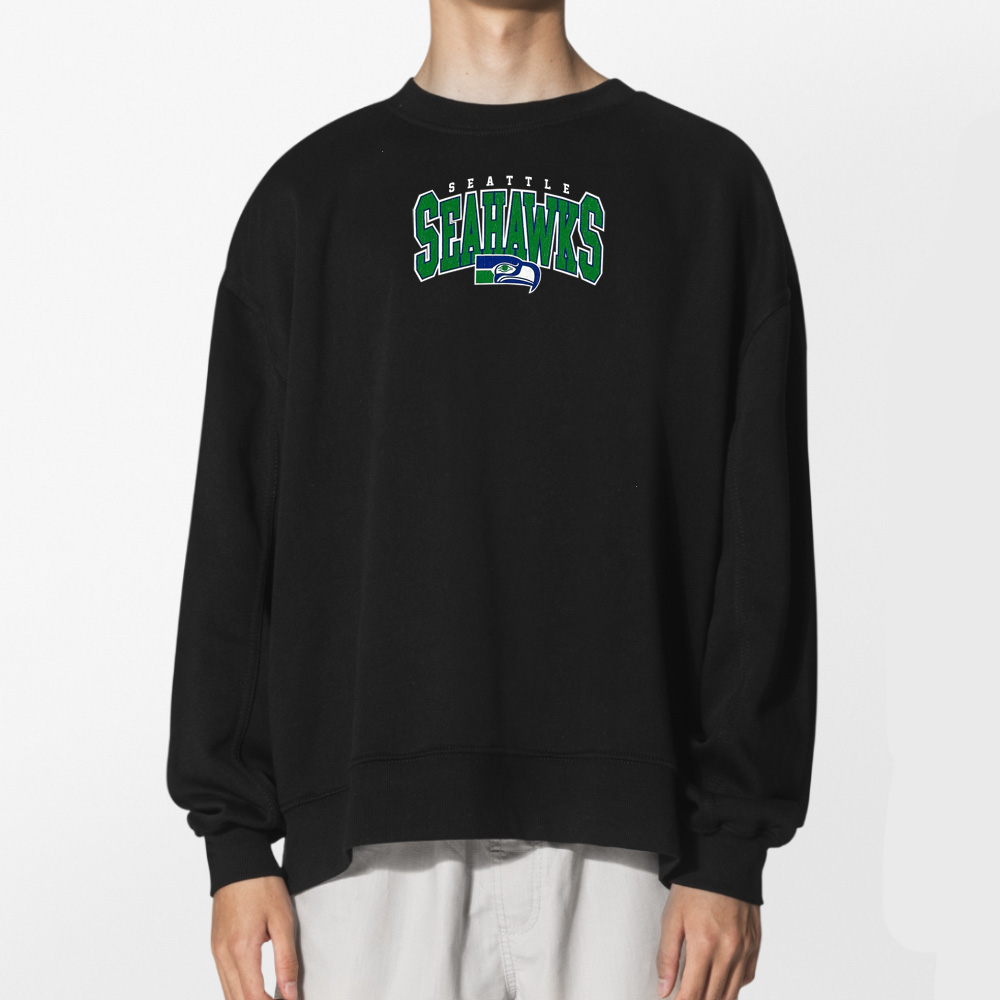 The front features a large SEATTLE SEAHAWKS varsity-style wordmark, inspired by traditional collegiate and vintage team apparel. The arched lettering paired with the iconic Seahawks logo creates a balanced, heritage-driven look that feels authentic, recognizable, and effortlessly bold.