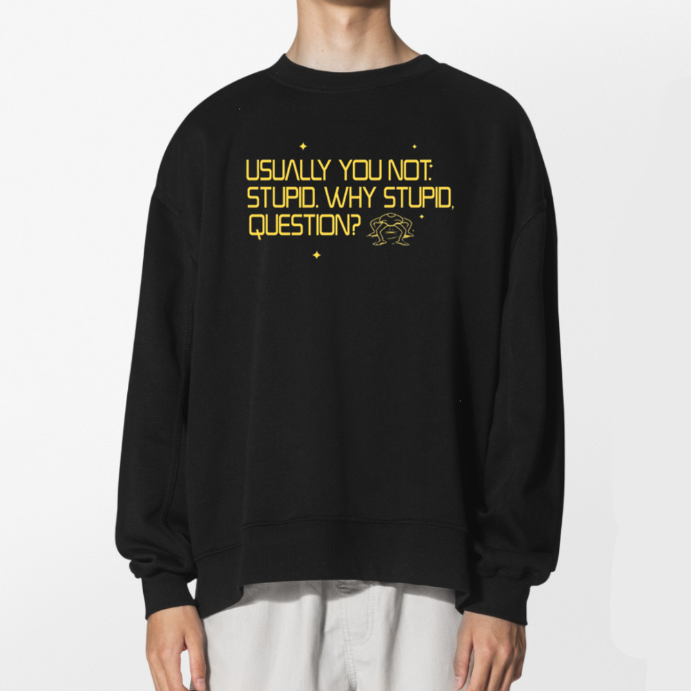 This shirt features the memorable and humorous line “Usually you not stupid. Why stupid, question?” presented in a bold, eye-catching font. It instantly resonates with readers who recognize the unique communication style from the story.