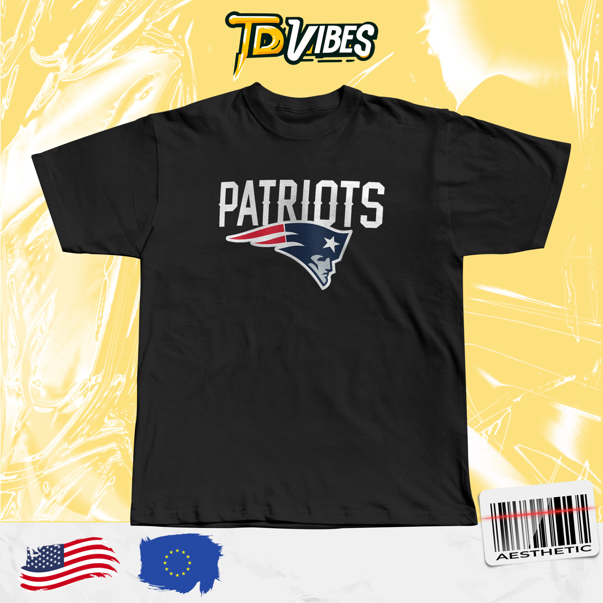 The front graphic features the iconic Patriots wordmark and logo, presented in a sharp, centered layout that emphasizes tradition and strength. The minimalist design keeps the focus on team identity, making it instantly recognizable while remaining timeless. This approach reflects TDVibes’ balance between bold sports culture and everyday wearable style.