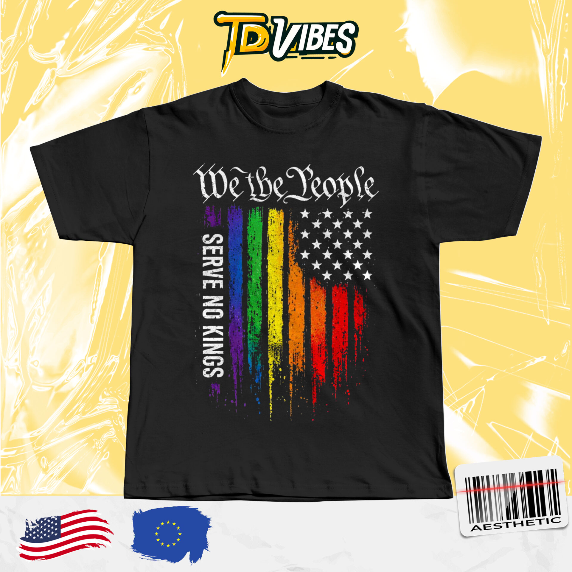 This shirt features the iconic phrase “We The People” combined with a striking American flag design in vibrant rainbow colors. The message “Serve No Kings” reinforces themes of independence and freedom, reflecting values rooted in democracy and individuality . The distressed print style adds a vintage, edgy touch that enhances its visual appeal.
